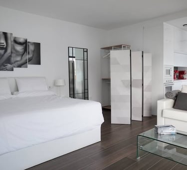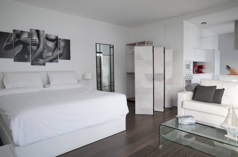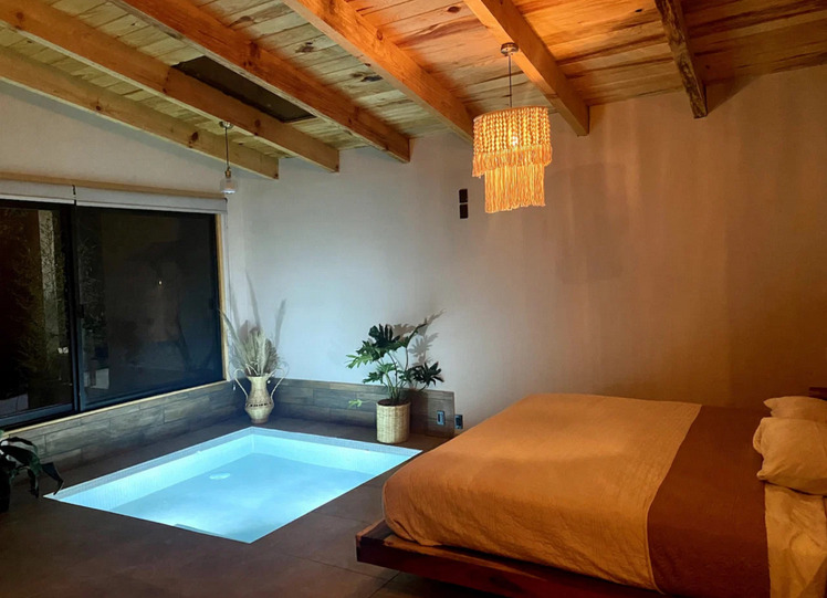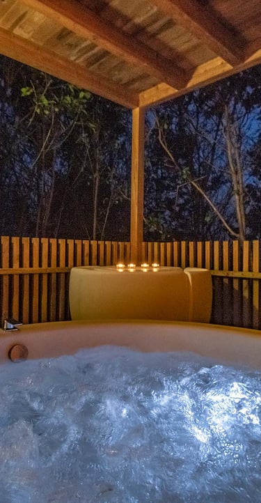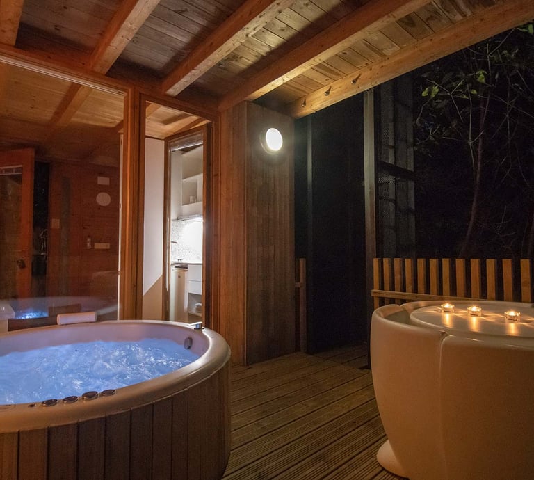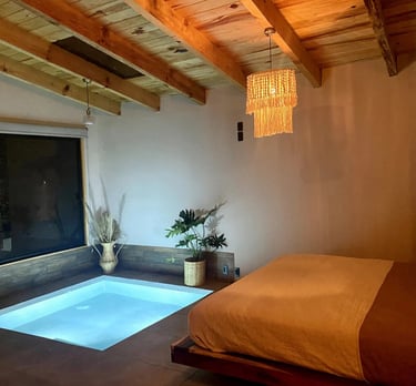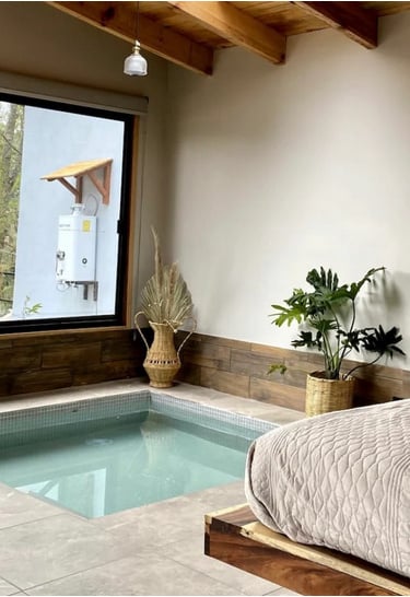 Pequeña cabaña con jacuzzi con hidromasaje adaptable a mini piscina, servicios de streaming (Netflix, YouTube Premium, HBO, Prime, Disney+), cama queen size, baño, climatizador, 1 plaza de parking, mini cocina