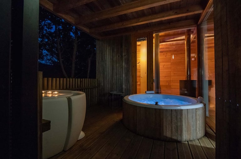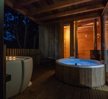 Lujosa cabaña con jacuzzi exterior, servicios de streaming (Netflix, YouTube Premium, HBO, Prime, Disney+), cama queen size, baño, aire acondicionado, chimenea, 1 plaza de parking, cocina, salón, barbacoa exterior