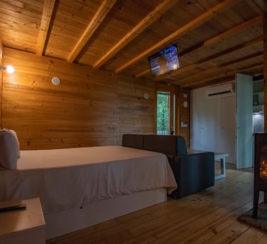 Cabaña rural con jacuzzi tipo hidromasaje privado,cocina equipada, servicios de streaming (Netflix, YouTube Premium, HBO, Prime, Disney+), cama queen size, sofacama en el salón, baño con ducha adaptable, aire acondicionado, calefacción, 1 plaza de parking