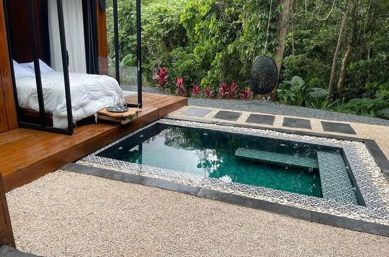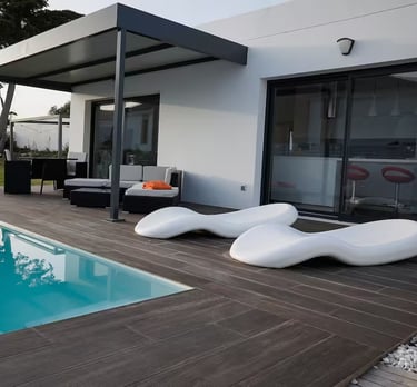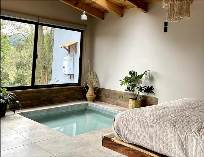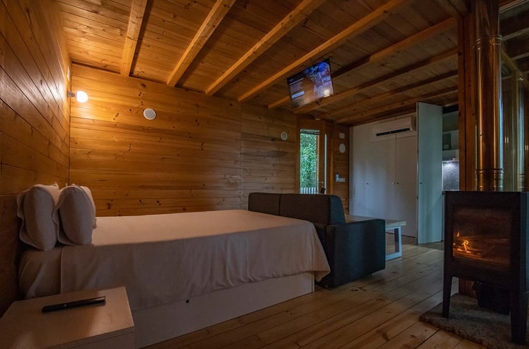Lujosa cabaña con piscina climatizada adaptable a jacuzzi, servicios de streaming (Netflix, YouTube Premium, HBO, Prime, Disney+), cama queen size, baño, aire acondicionado, chimenea, 1 plaza de parking, cocina, salón, barbacoa exterior