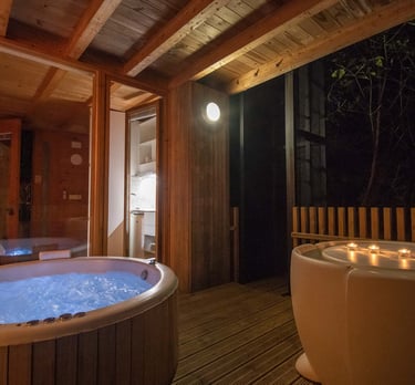 Lujosa cabaña con jacuzzi interior servicios de streaming (Netflix, YouTube Premium, HBO, Prime, Disney+), cama queen size, baño, aire acondicionado, chimenea, 1 plaza de parking, cocina, salón, barbacoa exterior