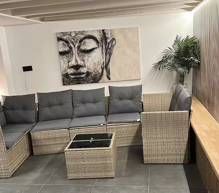 Cómoda tabaña tipo rural con jacuzzi tipo hidromasaje privado, barbacoa privada, servicios de streaming (Netflix, YouTube Premium, HBO, Prime, Disney+), cama queen size, baño con ducha adaptable, aire acondicionado, calefacción, 1 plaza de parking
